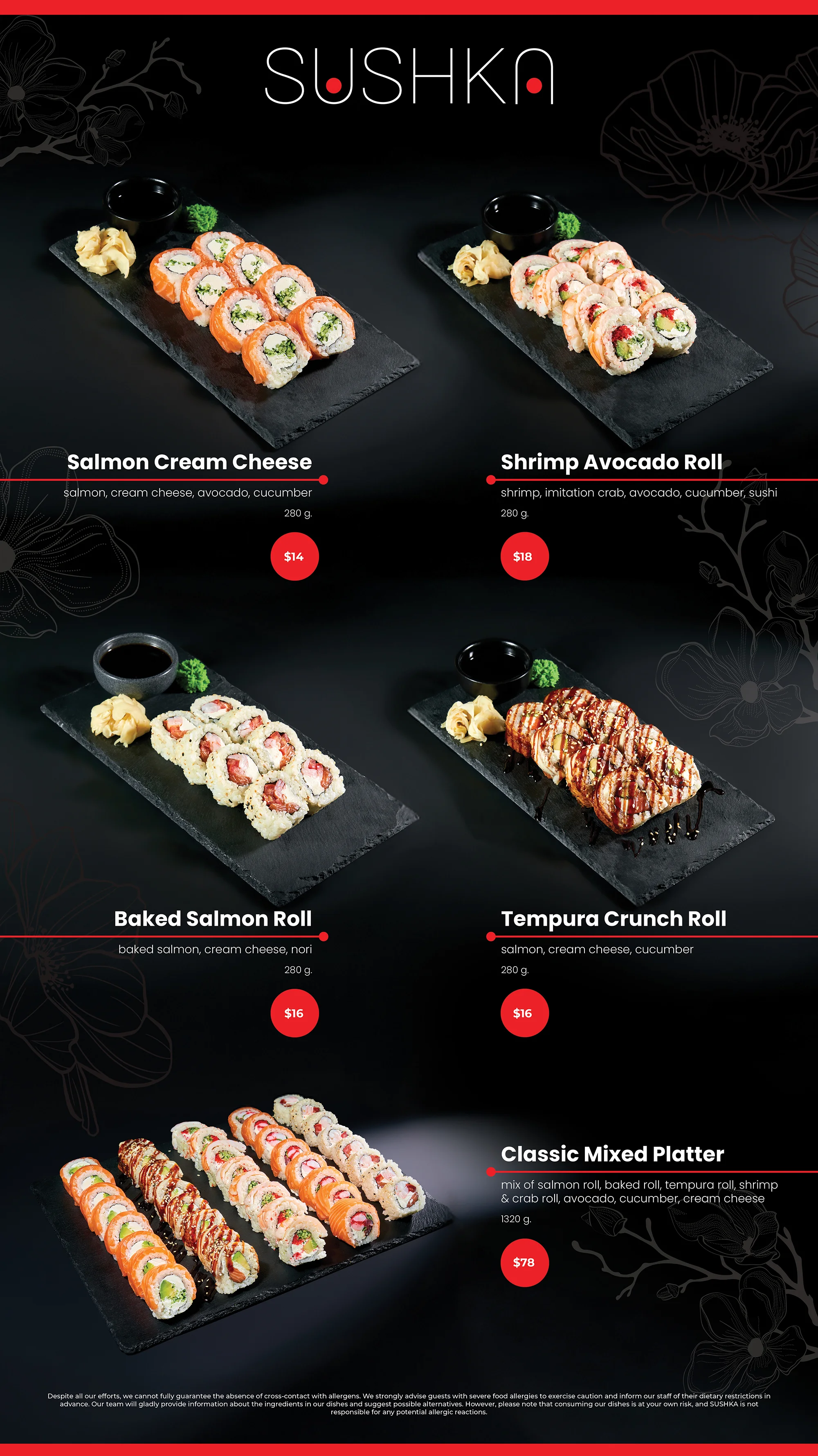 Designed a paper menu that is visually appealing, easy to navigate, and aligned with SUSHKA’s brand identity.